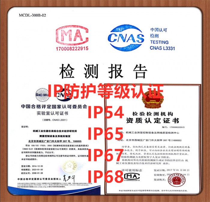 IP等级认证测试服务:IP1X、IP2X、IP21、IP31、IP41、IP52、IP53、IP54、IP65、IP66、IP67、IP68等。