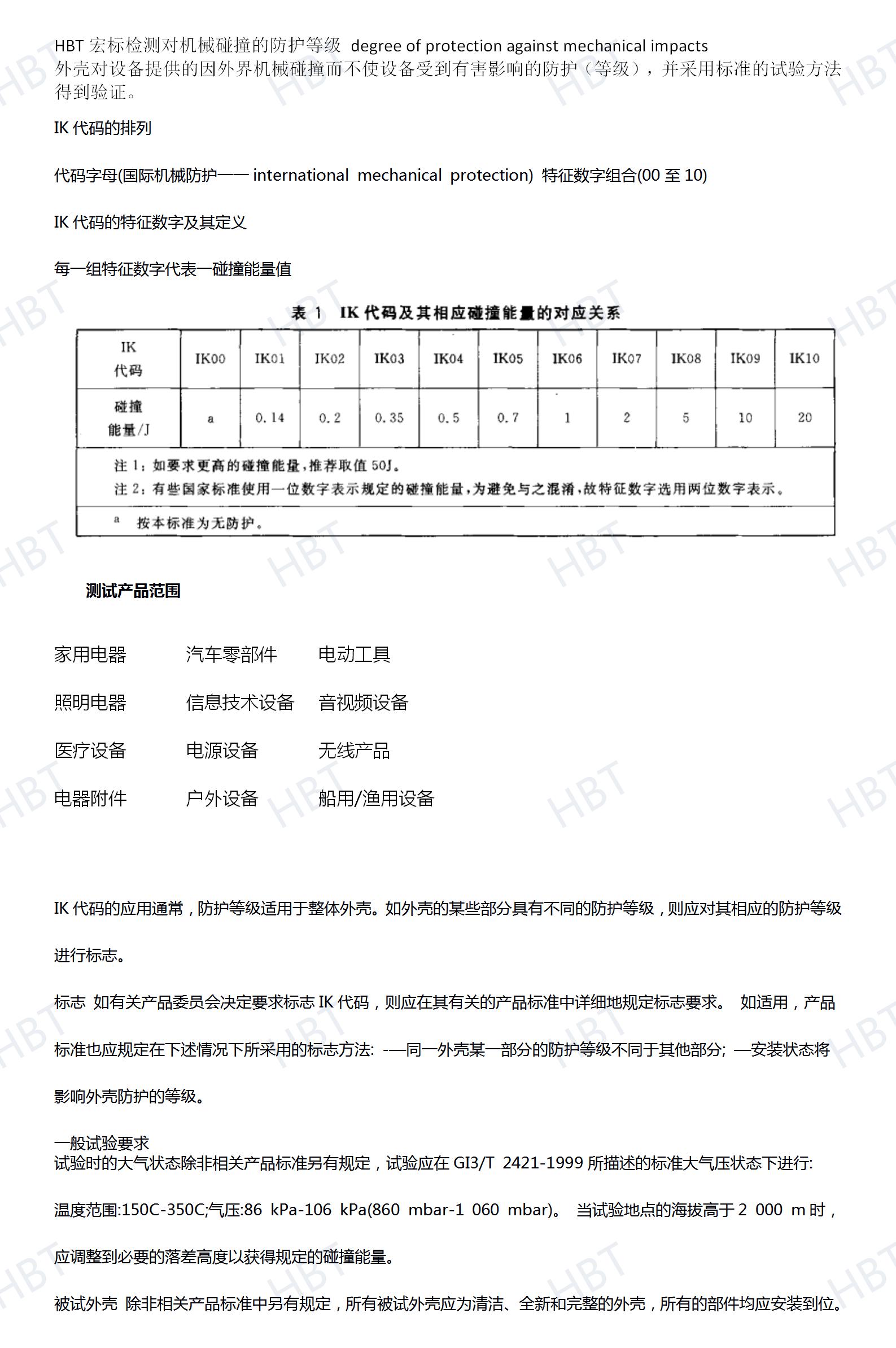 IK10防碰撞测试目的就让设备外壳为保护内部设备因受到机械碰撞而产生有害影响所具备的防护。 IK代码的应用通常,防护等级适用于整体外壳。【宏标检测】第三方权威机构,可以为您出具带有CNAS、ilac-MRA中国认可国际互认标识的权威公正的中、英文质量检验报告.在产品的研发、品质的鉴定、市场的拓展等方面发挥重要的作用。具体检验项目、费用来电联系。